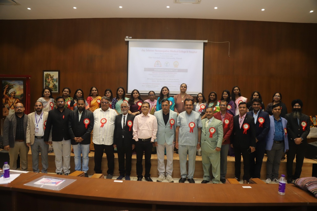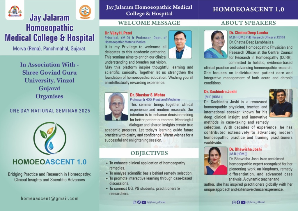 Homoeoascent 1.0 was conducted by JJHMCH in association with Shri Govind Guru University, Godhra on 21 December 2025, Sunday. Total 450 participants participated in the seminar. It was a one day successful seminar. The eminent speakers shared their knowledge with the participants and benefited and enlighten them. The objectives of the seminar were to enhance the clinical application of homoeopathic remedies, analysis of remedies selection on scientific basis , case based interactive learning for UG, PG, and practitioner and researcher.