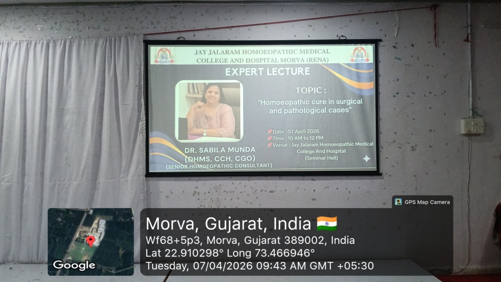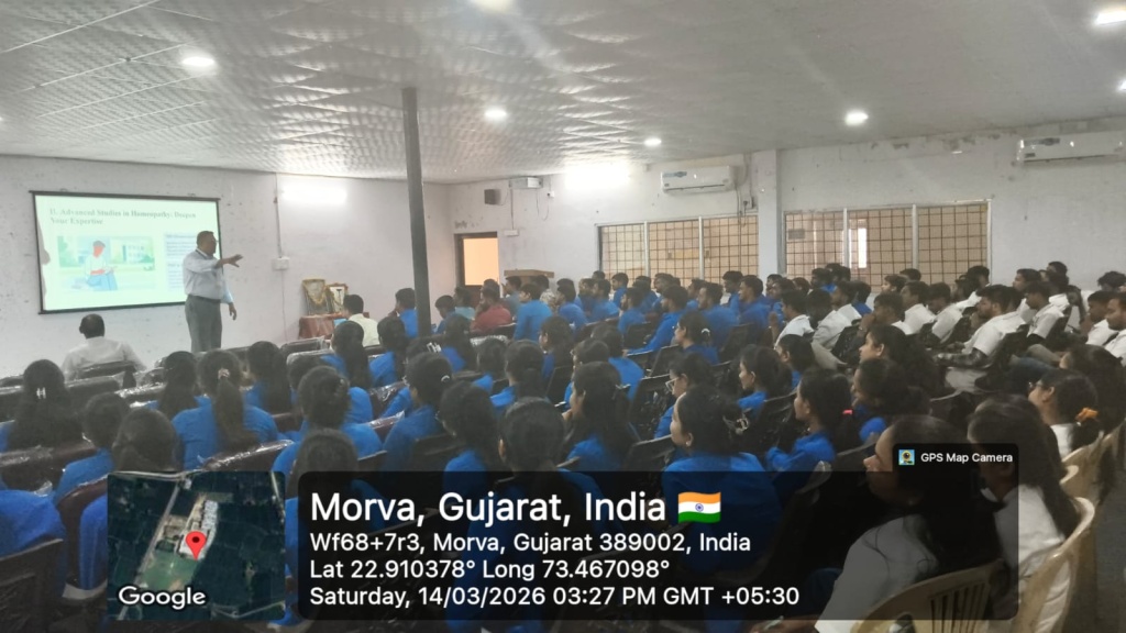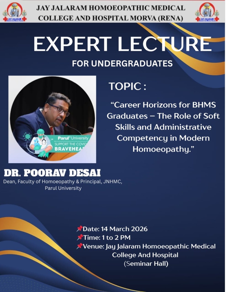 14/03/2026: Expert Lecture for Undergraduates on “Career Horizons for BHMS Graduates- The role of soft skills and administrative competency in modern homoeopathy” by Dr. Poorav Desai at Jay Jalaram Homoeopathic Medical College
