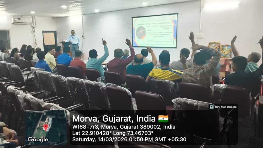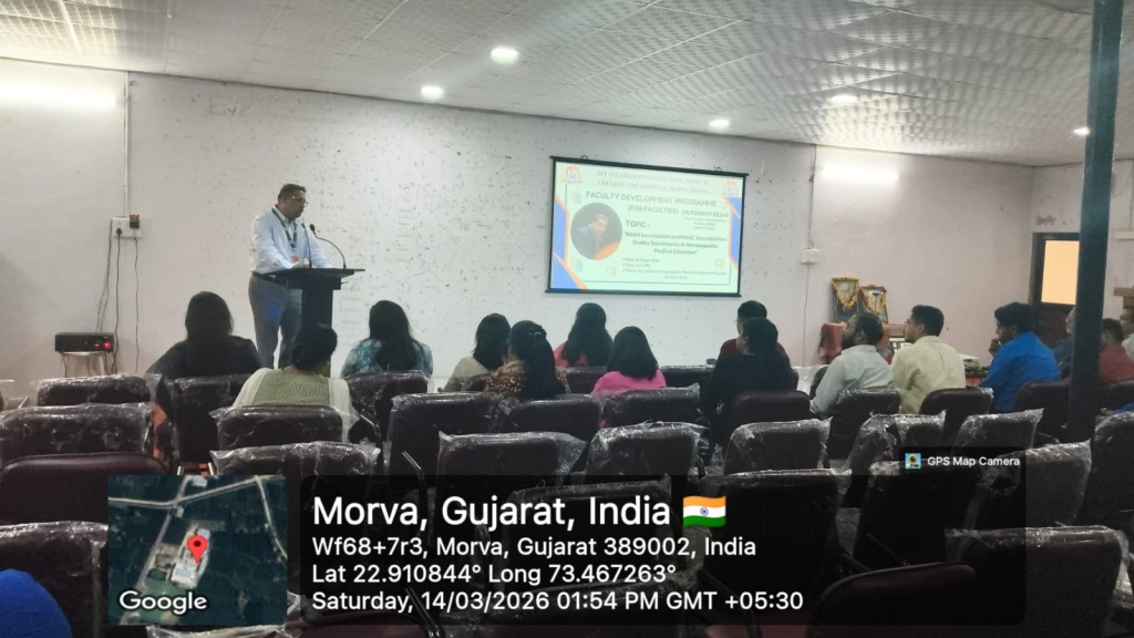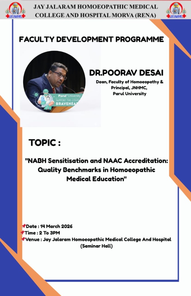 14/03/2026: Faculty Development Programme on “NABH Sensitization and NAAC Accreditation: Quality Benchmarks in Homoeopathic Medical Education” by Dr. Poorav Desai at Jay Jalaram Homoeopathic Medical College